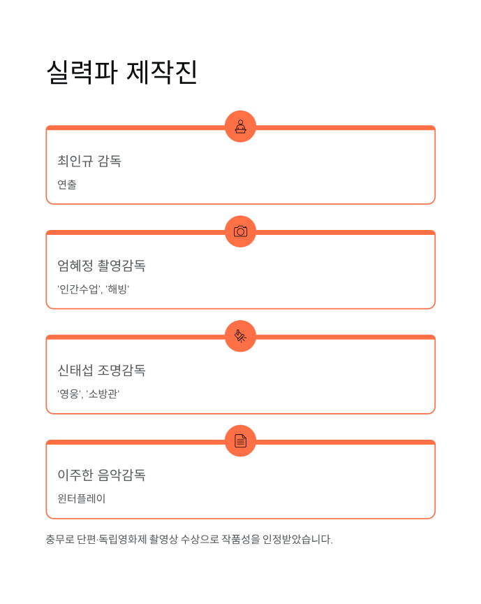 '인간수업', '해빙'의 엄혜정 촬영감독과 '영웅', '소방관'의 신태섭 조명감독, 재즈 그룹 윈터플레이의 이주한 음악감독까지! 실력파 스태프들이 모여 완성도를 높였습니다.