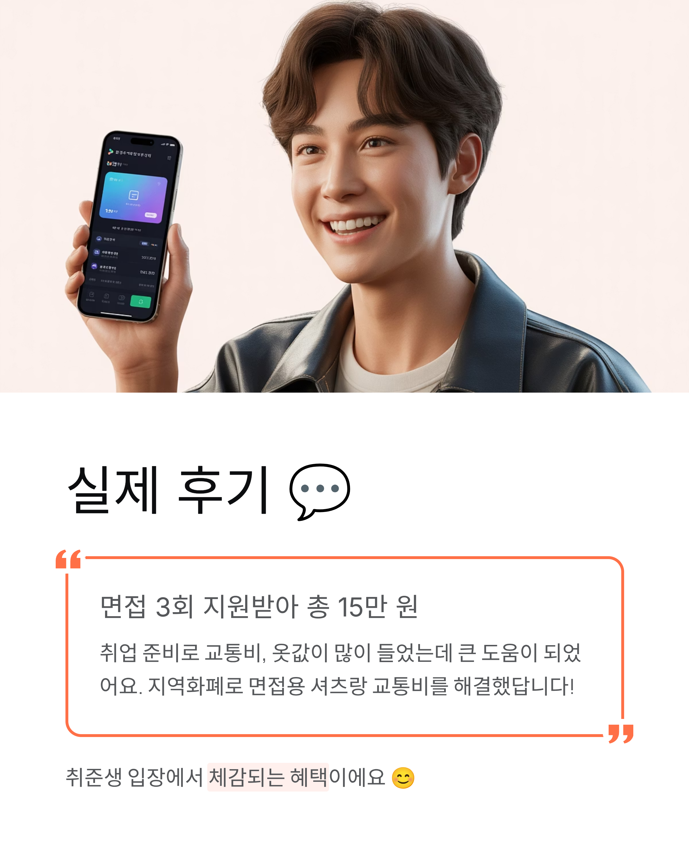 실제로 저는 작년에 이 제도로 면접 3회 지원받아서 총 15만 원 지역화폐를 받았어요. 취업 준비로 교통비, 옷값이 많이 들었는데 큰 도움이 되었답니다 😊