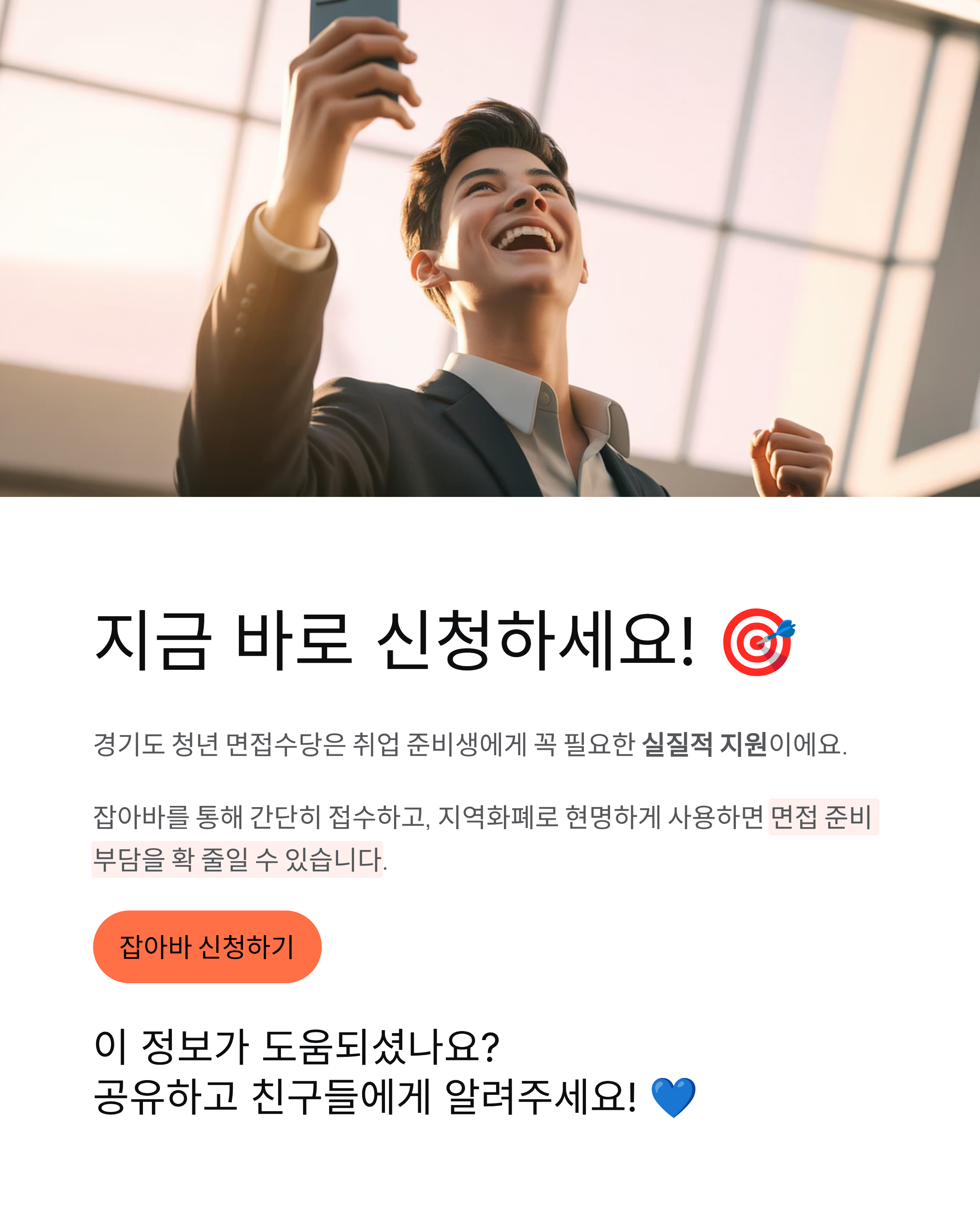요약하자면, 경기도 청년 면접수당은 취업 준비생에게 꼭 필요한 실질적 지원이에요. 잡아바를 통해 간단히 접수하고, 지역화폐로 현명하게 사용하면 면접 준비 부담을 확 줄일 수 있습니다.