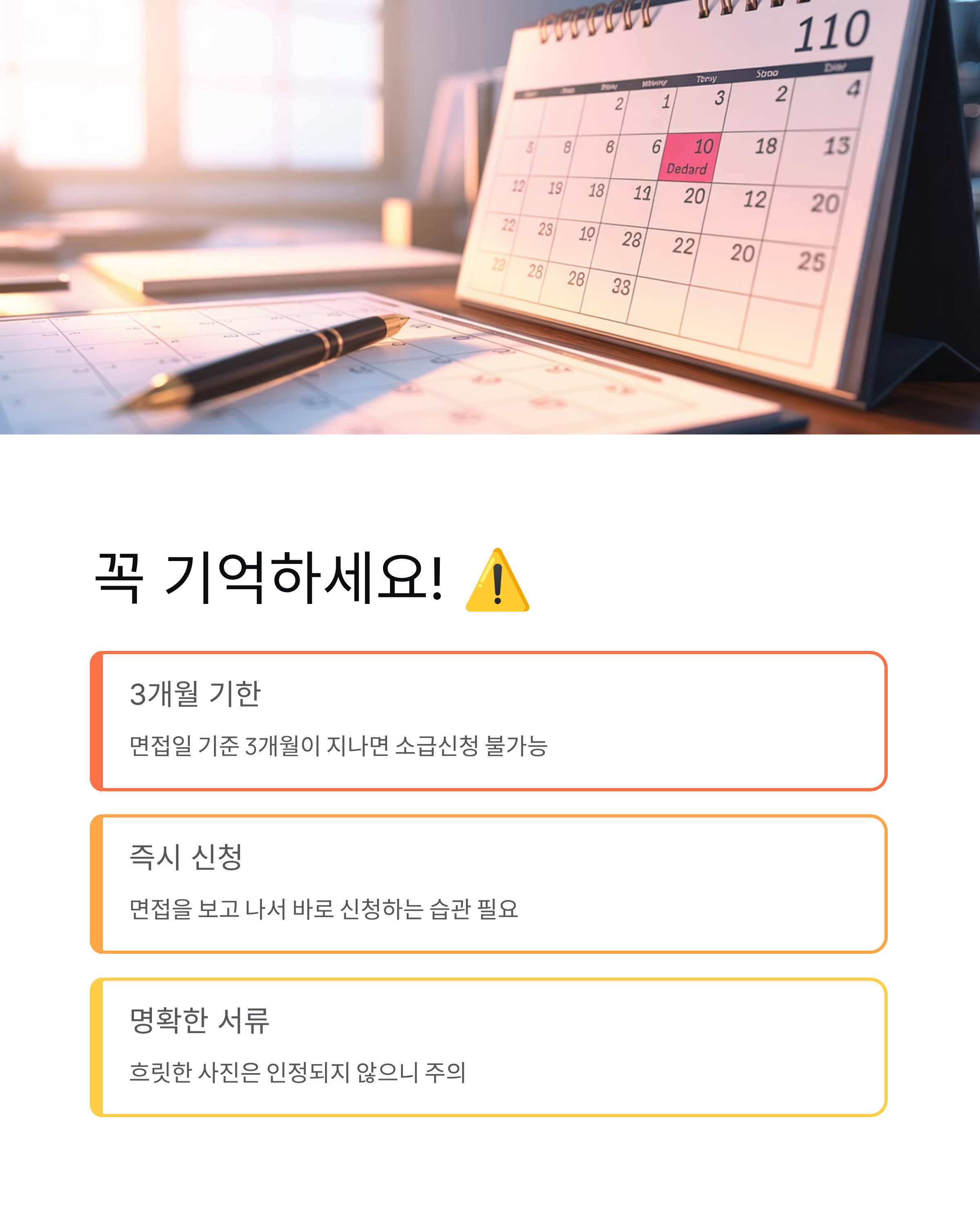 또한, 면접일 기준 3개월이 지나면 소급신청이 불가능하니 면접을 보고 나서 바로 신청하는 습관을 들이는 게 중요해요!
