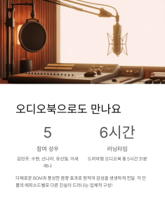 이 작품은 오디오북으로도 제작되었어요! 김민주, 수현, 신나리, 유선일, 이세레나 성우 5인이 참여한 드라마형 오디오북으로, 약 6시간(5시간 31분)의 러닝타임으로 완성되었답니다. 다채로운 BGM과 풍성한 음향 효과가 더해져서 원작의 감성을 더욱 생생하게 느낄 수 있어요.