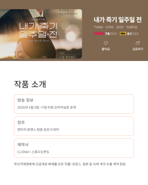 '내가죽기일주일전'은 서은채 작가의 원작 소설을 바탕으로 공명과 김민하 주연으로 제작된 티빙 오리지널 시리즈예요. 6년 전 죽은 첫사랑이 저승사자가 되어 돌아오는 감성 판타지 로맨스로, 2025년 4월 3일부터 4월 17일까지 공개되었죠. CJ ENM과 스튜디오몬도가 제작했고, 정건주와 오우리 등이 조연으로 출연했답니다.