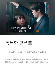 이 작품의 독특한 콘셉트는 '저승사자는 사랑하는 사람의 모습을 하고 찾아온다'는 전승 괴담에서 착안했어요. 세상을 등지고 청춘을 흘려보내던 주인공 희완 앞에 6년 전 교통사고로 죽은 첫사랑 람우가 저승사자가 되어 나타나면서 벌어지는 이야기죠. "내가 죽기 일주일 전, 네가 내게 돌아왔다"는 문구가 정말 강렬해요!