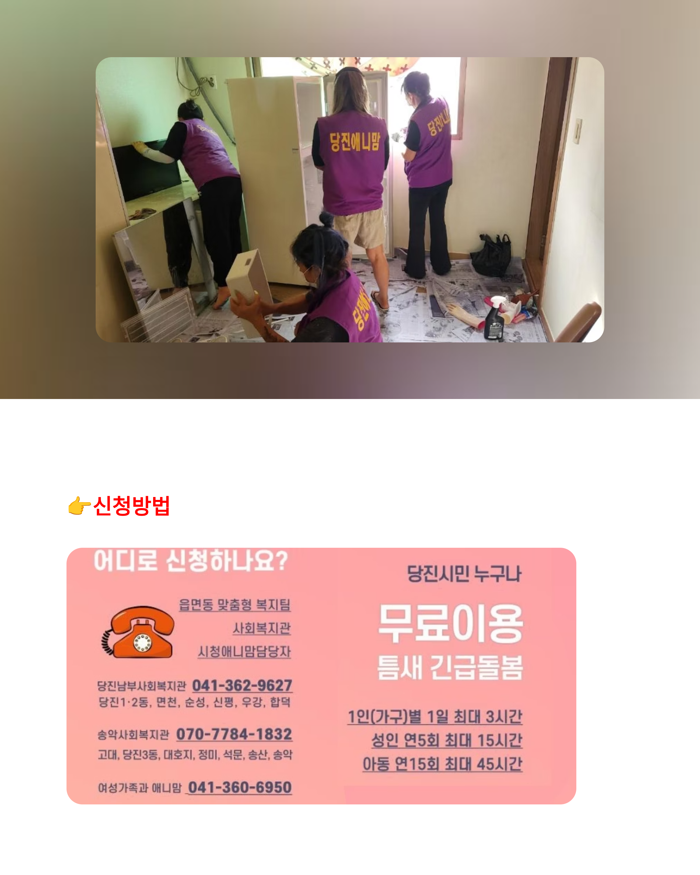 기존에는 5회였는데 올해 15회로 대폭 늘어나면서 맞벌이 부모님들이 정말 많이 도움받을 것 같아요. 실제로 송악읍에서 3자녀를 홀로 키우는 한 부자가정을 찾아 집 청소를 도왔는데, 가정의 부담이 크게 줄었다고 해요.