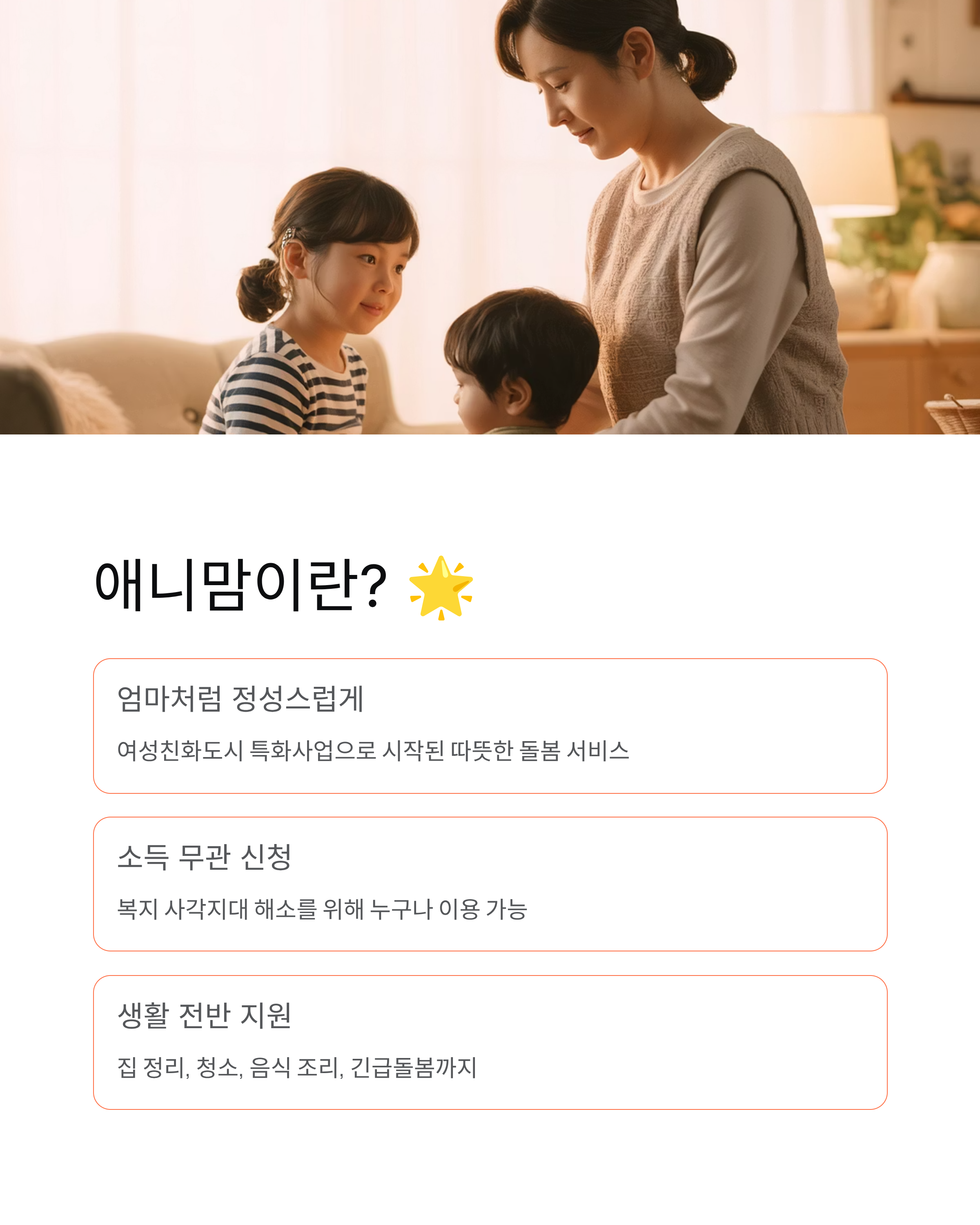 가장 큰 특징은 소득 수준과 관계없이 누구나 신청할 수 있다는 점이에요! 기존 복지 서비스는 소득 기준이 까다로워 정작 필요한 분들이 혜택을 못 받는 경우가 많았는데, 애니맘은 복지 사각지대를 해소하기 위해 만들어졌어요. 집 정리나 청소, 음식 조리, 긴급돌봄 등 일상생활에서 꼭 필요한 서비스를 제공한답니다.