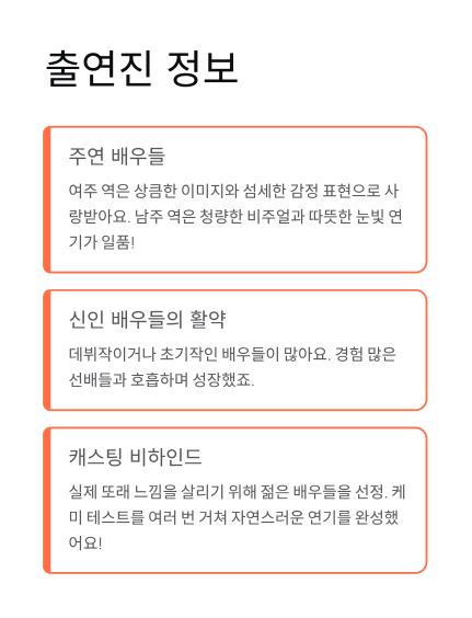조연 배우들도 실력파들이라서 주연 못지않게 빛나요. 특히 친구 역할을 맡은 배우들의 케미가 정말 자연스러워서 실제 친구 같은 느낌이 들더라고요.