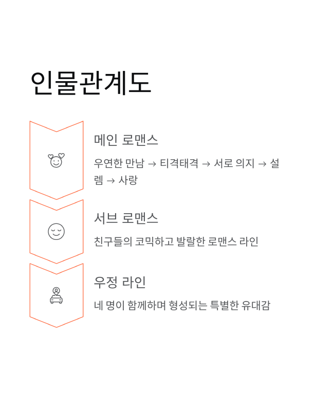 여주 친구 ↔ 남주 친구의 관계도 재미있어요! 메인 커플과는 다른 스타일의 로맨스를 보여주는데, 더 코믹하고 발랄한 느낌이에요. 이 둘도 처음엔 티격태격하다가 점점 끌리게 되는 패턴!