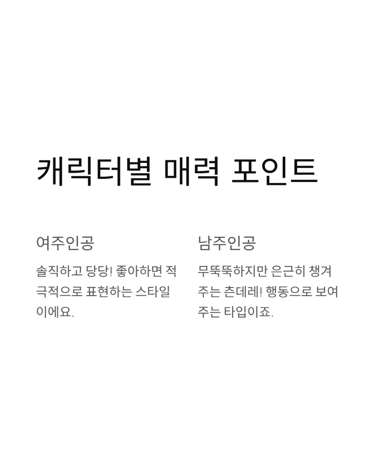 솔직하고 당당한 태도가 매력적이에요. 자기 감정에 솔직하고, 좋아하면 적극적으로 표현하는 스타일이죠. 하지만 상처받으면 숨기려고 하는 모습도 있어서 인간적이에요.