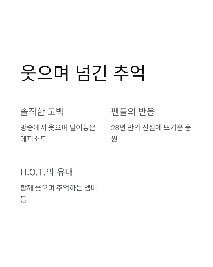 오랜 시간이 지나 비로소 털어놓을 수 있게 된 이 에피소드는 H.O.T.의 소중한 추억이 됐어요.