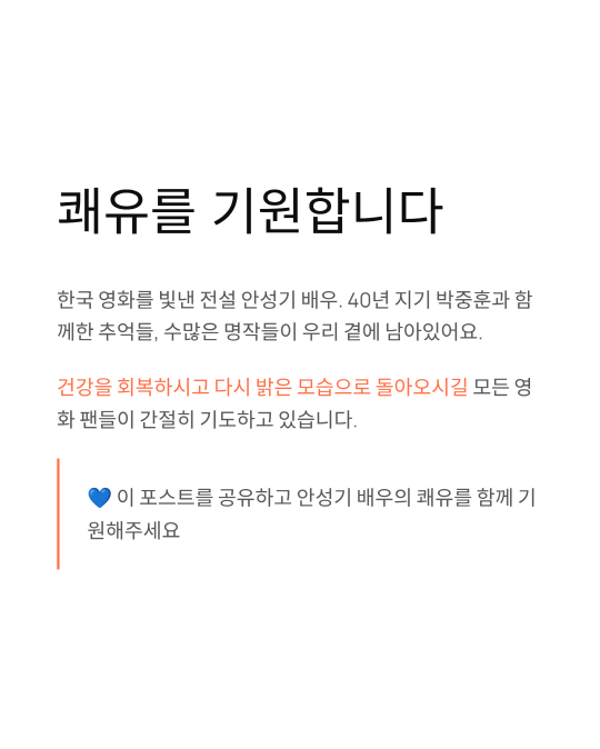 많은 영화 팬들이 안성기 배우의 쾌유를 기원하고 있어요. 한국 영화를 빛낸 전설이니만큼 꼭 건강을 회복하시길 바라는 마음이에요.
