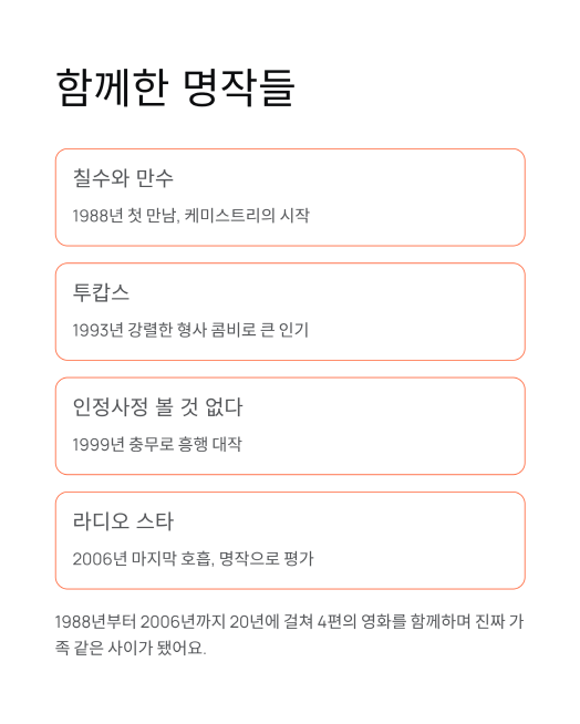 1988년부터 2006년까지 거의 20년에 걸쳐 4편의 영화를 함께 했어요. 단순히 선후배 관계가 아니라 진짜 가족 같은 사이가 된 거죠.