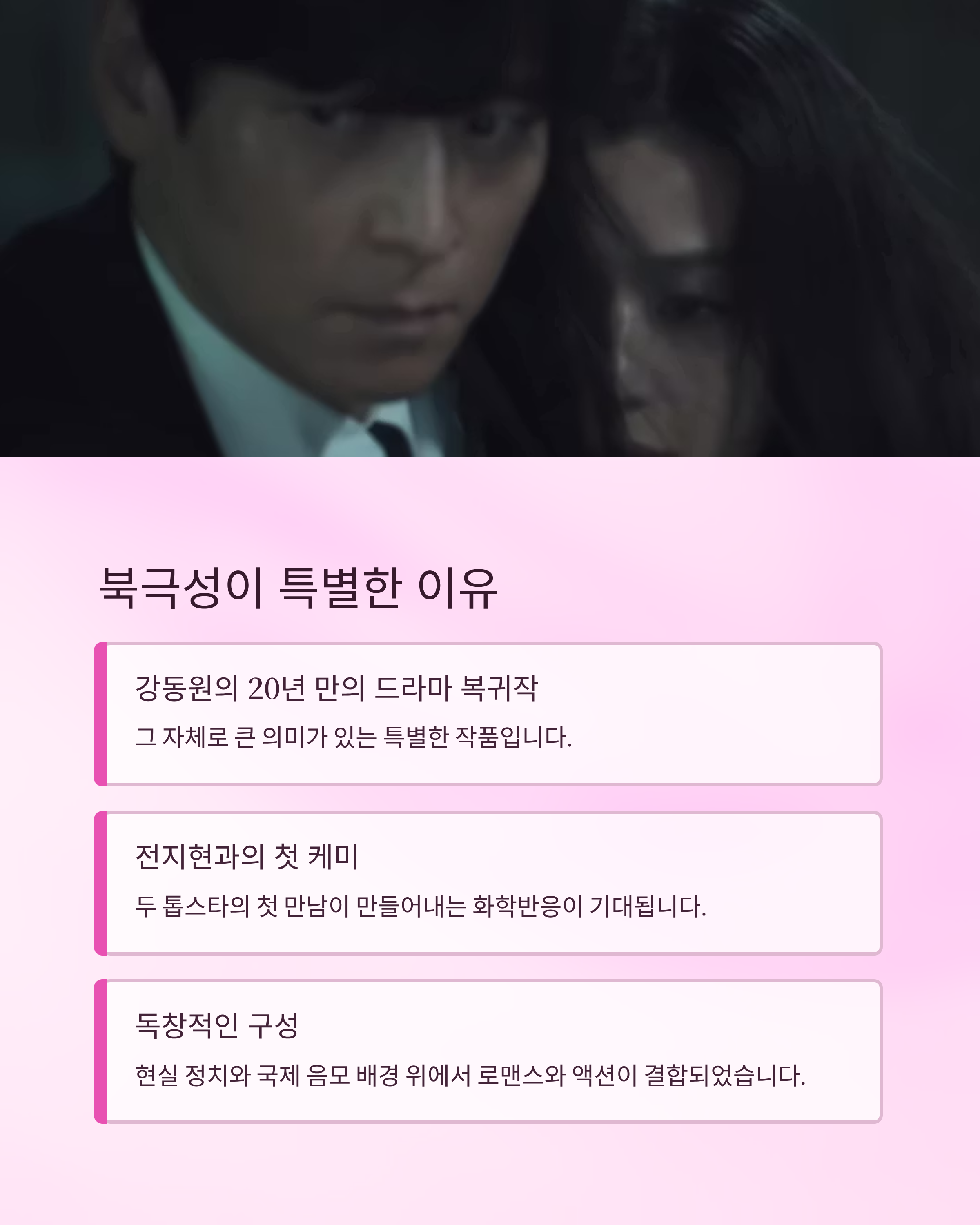 강동원의 20년 만의 드라마 복귀작이라는 점, 그리고 전지현과의 첫 케미는 그 자체로 큰 의미가 있습니다. 또한 현실 정치와 국제 음모라는 배경 위에서 로맨스와 액션이 결합된 구성이 독창적입니다.