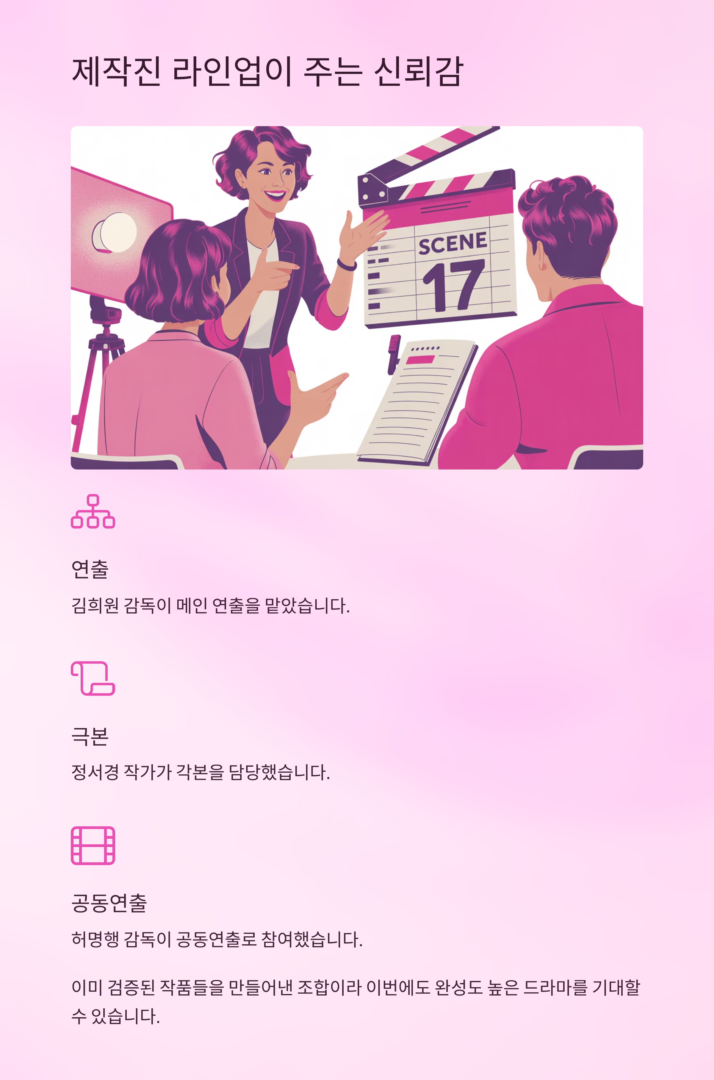 연출은 김희원 감독, 극본은 정서경 작가, 공동연출은 허명행 감독이 맡았습니다. 이미 검증된 작품들을 만들어낸 조합이라 이번에도 완성도 높은 드라마를 기대할 수 있습니다.