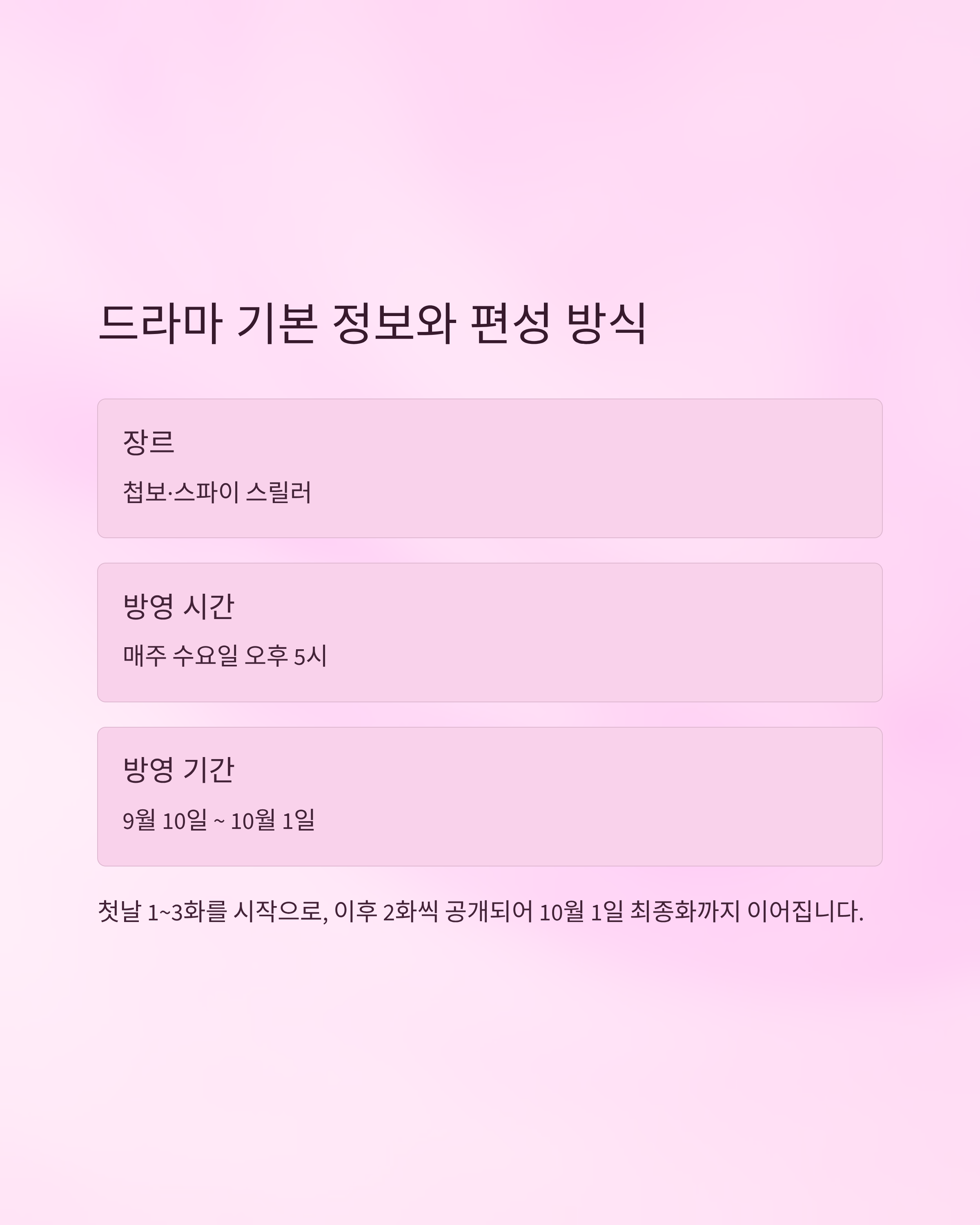 북극성은 첩보·스파이 스릴러 장르로, 매주 수요일 오후 5시에 새로운 에피소드가 공개됩니다. 첫날 1~3화를 시작으로, 이후 2화씩 공개되어 10월 1일 최종화까지 이어집니다.