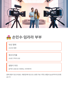 손민수와 임라라는 10년 열애 끝에 2023년 결혼, 유튜브 채널 '엔조이커플'로 259만 구독자를 보유한 인기 크리에이터 부부예요.