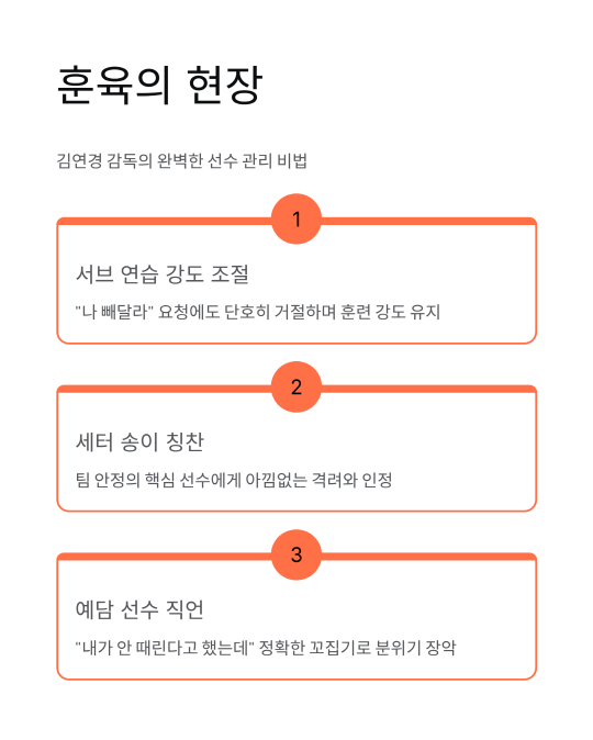 김연경 감독은 칭찬과 혼내기를 넘나들며 선수들을 완벽하게 이끌어요. 한 선수가 서브 연습을 너무 세게 해서 “나 빼달라” 요청했지만 단호히 거절했고, 세터 송이 선수에겐 팀 안정에 큰 힘이라 칭찬을 아끼지 않았죠. 예담 선수에겐 “내가 안 때린다고 했는데 때렸잖아”라고 정확히 꼬집는 직언으로 분위기를 잡았답니다.