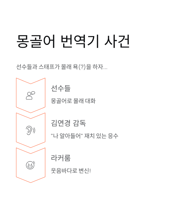 쿠시 선수는 서브 미스 3개에도 리시브를 잠시 피한 덕에 행복해하며, 감독은 이내 다시 요령껏 시킬 거라 밝혔어요. 또 선수들과 스태프들이 몽골어 번역기라며 몰래 욕(?)을 하자, 김 감독도 “나 알아들어”라며 재치 있게 응수, 라커룸이 웃음바다가 되기도 했답니다.