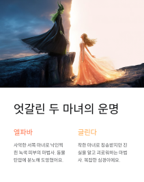 서쪽에서 은신하며 마법을 익히는 엘파바와 사람들의 사랑을 받지만 진실을 알고 괴로워하는 글린다. 이 둘의 우정은 과연 어떻게 될까요?