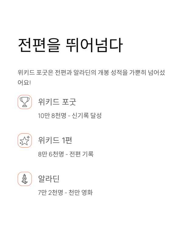 더 놀라운 건 전편 '위키드'(8만 6,186명)의 개봉일 스코어를 가뿐히 넘어섰다는 거예요! 뮤지컬 천만 영화 '알라딘'(7만 2,736명)보다도 높은 수치랍니다.