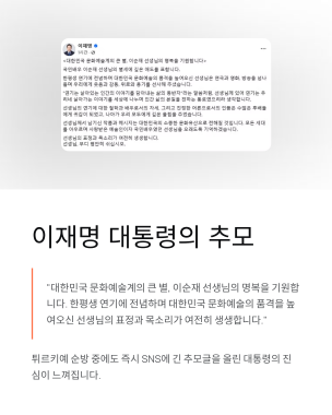 선생님의 표정과 목소리가 여전히 생생하다. 부디 평안히 쉬십시오” 대통령이 이렇게 진심 어린 글을 쓰신 걸 보니, 선생님이 얼마나 큰 존재였는지 다시 한번 느껴지더라고요.