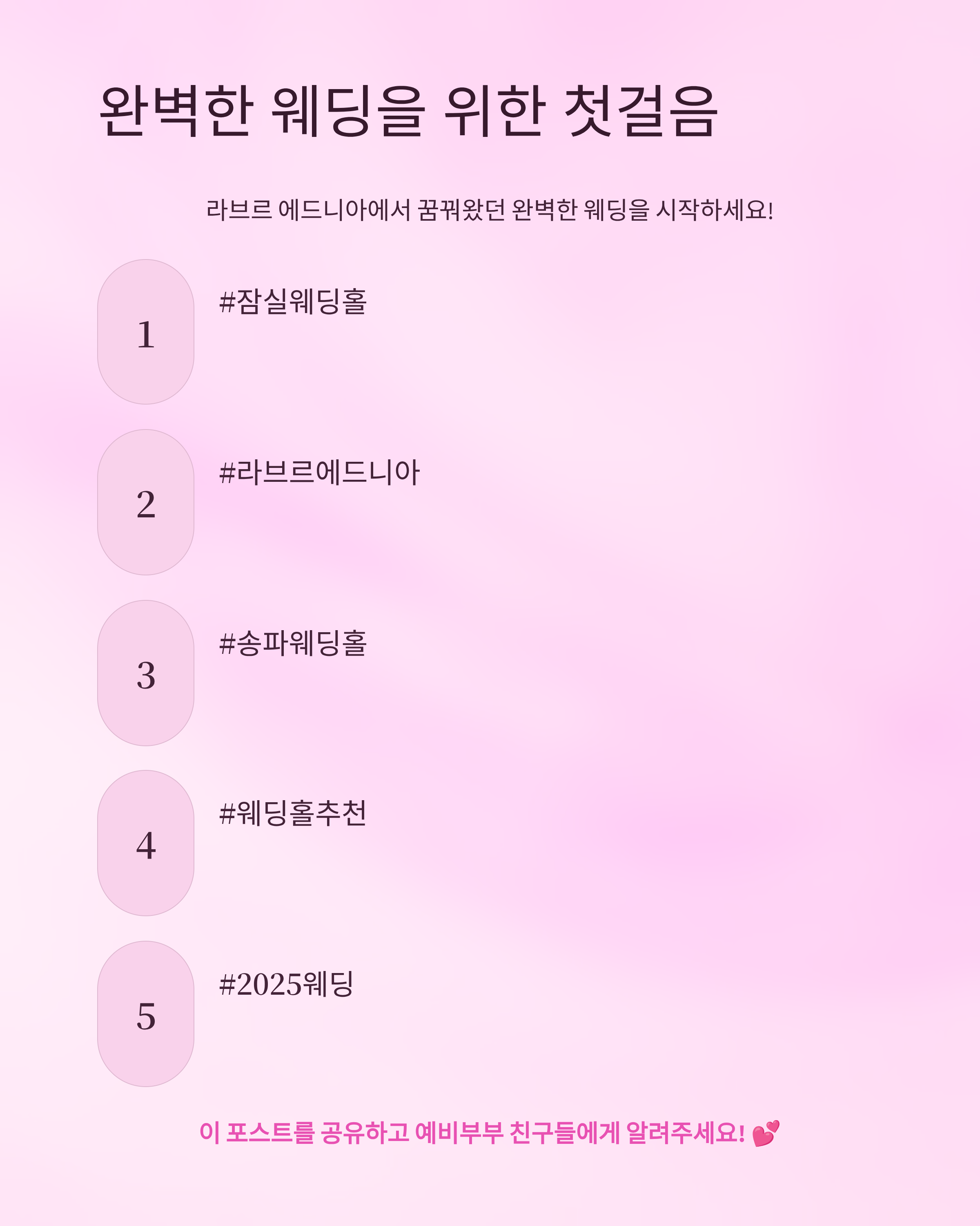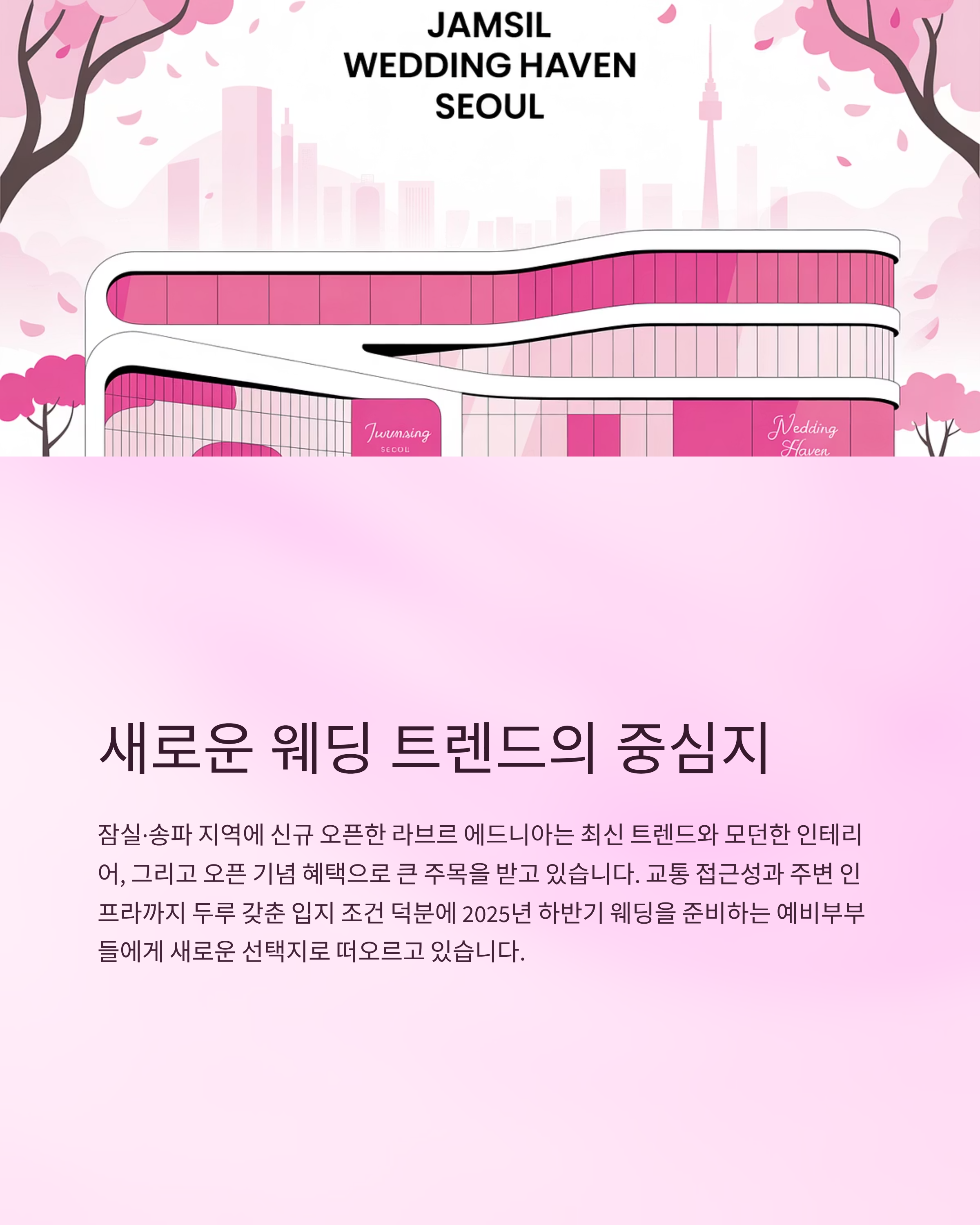 잠실·송파 지역에 신규 오픈한 라브르 에드니아는 최신 트렌드와 모던한 인테리어, 그리고 오픈 기념 혜택으로 큰 주목을 받고 있습니다. 교통 접근성과 주변 인프라까지 두루 갖춘 입지 조건 덕분에 2025년 하반기 웨딩을 준비하는 예비부부들에게 새로운 선택지로 떠오르고 있습니다.