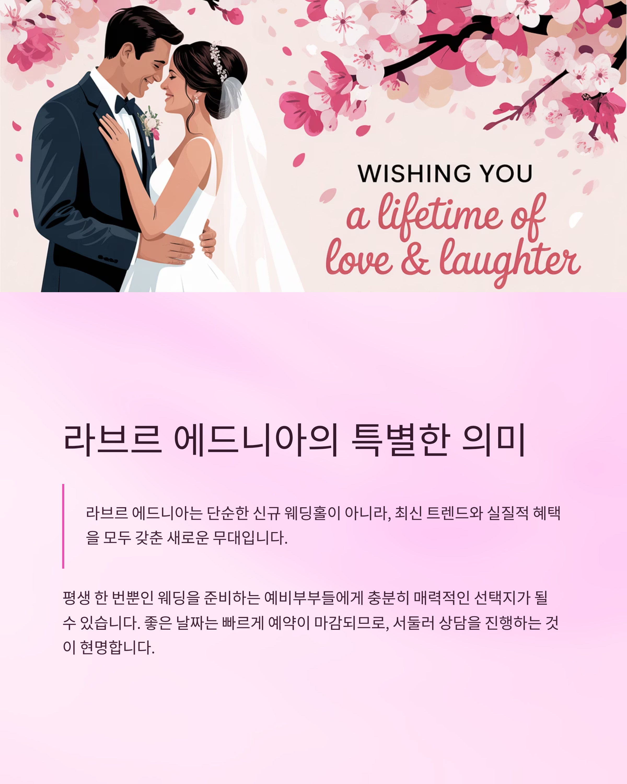 라브르 에드니아는 단순한 신규 웨딩홀이 아니라, 최신 트렌드와 실질적 혜택을 모두 갖춘 새로운 무대입니다. 평생 한 번뿐인 웨딩을 준비하는 예비부부들에게 충분히 매력적인 선택지가 될 수 있습니다. 좋은 날짜는 빠르게 예약이 마감되므로, 서둘러 상담을 진행하는 것이 현명합니다.