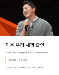 그런데 영화 '좀비딸' 촬영장에서 거미의 "둘째 갖자" 한마디에 즉시 결정! 조정석은 "그 자리에서 계획 세웠다"고 웃으며 털어놨어요. 진짜 로맨틱하죠?