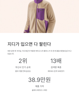 지드래곤 파타고니아 후리스는 클래식 레트로-X 재킷으로, 38만 9000원에 판매되고 있어요. 공항패션으로 선보인 이후 무신사에서 인기 순위 2위로 급상승하고, 관련 검색량이 최대 16배까지 폭증하며 품절 대란을 일으키고 있죠.
