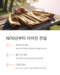 이 재킷의 특별한 점은 1970년에 처음 출시된 역사적인 제품이라는 거예요. 혹독한 추위를 견뎌야 했던 북대서양 어부들의 작업복에서 디자인적 영감을 얻어 탄생했죠. 재활용 폴리에스터 소재를 사용해 친환경적이면서도, 보온성이 뛰어나 가을부터 겨울까지 오래 입을 수 있는 아이템이에요.