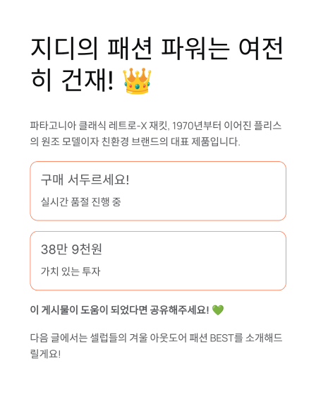 무신사 통계에 따르면 11월 3일부터 5일까지 기간 동안 '파타고니아' 검색량이 전년 동기 대비 70% 증가했고, '파타고니아 레트로'는 무려 13배, '레트로X'는 16배나 급증했다고 해요. 이런 수치는 지드래곤의 영향력이 얼마나 대단한지를 보여주는 증거죠!