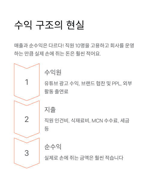 하지만 쯔양은 바로 현실적인 이야기도 덧붙였어요. "이제 또 나가는 것도 많다. 매출과 순수익은 다르다"면서 직원 10명을 고용하고 회사를 운영하는 만큼 실제 손에 쥐는 돈은 훨씬 적다고 했죠.