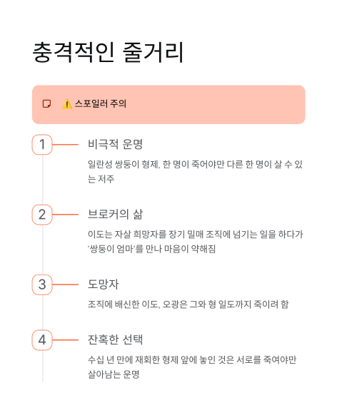 이 사실을 알게 된 밀매 조직 보스 오광은 이도를 잡아 죽이려 하고, 이도는 도망자 신세가 돼요. 도망치던 중 오광이 자신의 친형 일도까지 죽이려 한다는 걸 알게 되고, 수십 년 만에 형제가 재회하죠. 하지만 이들 앞에 놓인 건 서로를 죽여야만 살아남을 수 있는 잔혹한 선택뿐이에요.