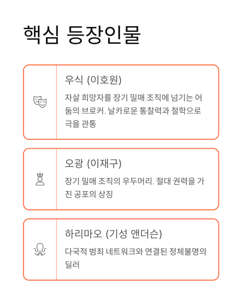 자살 희망자들을 돕는 척하며 장기 밀매 조직에 넘기는 어둠의 브로커. 날카로운 통찰력과 철학으로 극 전체를 관통하는 핵심 인물이에요.