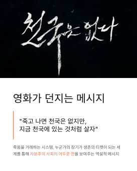 천국은 없다가 던지는 메시지는 강렬해요. "죽고 나면 천국은 없지만, 지금 천국에 있는 것처럼 살자"는 역설적인 메시지가 가슴에 오래 남아요. 영화는 죽음을 거래하는 시스템, 누군가의 장기가 또 다른 생존의 티켓이 되는 세계를 통해 자본주의 사회의 어두운 면을 보여줘요.