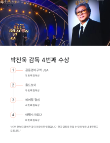 박찬욱 감독은 '공동경비구역 JSA', '올드보이', '헤어질 결심'에 이어 이번이 네 번째 청룡영화상 감독상이에요. 미국 체류 중이라 직접 참석하지 못했지만, 이성민이 대신 수상 소감을 전했답니다.