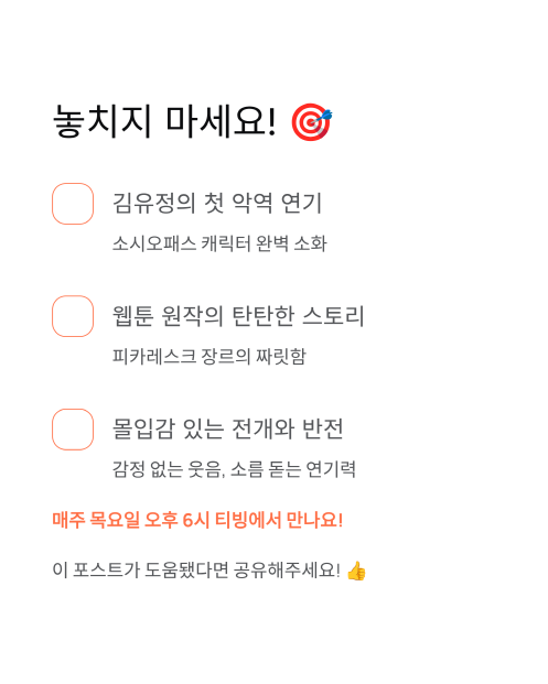 1화부터 완전 몰입했어요. 김유정이 예쁜 얼굴로 방긋 웃으면서 소름 돋는 대사를 치는데 진짜 무서우면서도 매력적이더라고요. 웹툰 원작을 안 봐서 더 신선하게 다가왔고요. 소시오패스가 사람들을 어떻게 이용하는지 보는 게 무섭지만 짜릿해요. 12부작이라 부담 없이 몰아볼 수 있을 것 같아요!