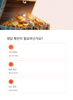 정답 페이지에서는 오늘 출제된 7개 브랜드 퀴즈의 정답을 깔끔하게 정리해놨어요. 일부 문제는 여러 개의 정답이 있으니, 그것들도 함께 확인하실 수 있답니다. 지금 바로 확인하고 캐시 받아가세요!