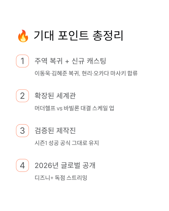디즈니+ 오리지널 한국 드라마로, 2024년 12월 31일 제작 확정됐고 2025년 4월 21일 캐스팅 공개됐어. 첫 촬영 돌입한 지 몇 달, 2026년 글로벌 공개 예정. 시즌1의 흥행 덕에 속전속결 제작됐네. 나처럼 기다리던 팬들 환호할 만해!