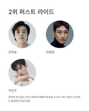 2위를 차지한 '퍼스트 라이드'는 화려한 캐스팅으로 주목받고 있는 코미디 영화예요. 강하늘, 김영광, 차은우, 강영석, 한선화까지 출연하니 관심이 클 수밖에 없죠!
