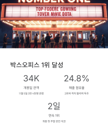 11월 5일 개봉과 동시에 바로 박스오피스 1위를 차지한 이 영화는, 다음날인 6일에도 여전히 정상 자리를 지켰어요. 개봉일에는 3만 4천여 명이 관람했고, 그다음 날엔 2만 4천여 명이 극장을 찾았답니다