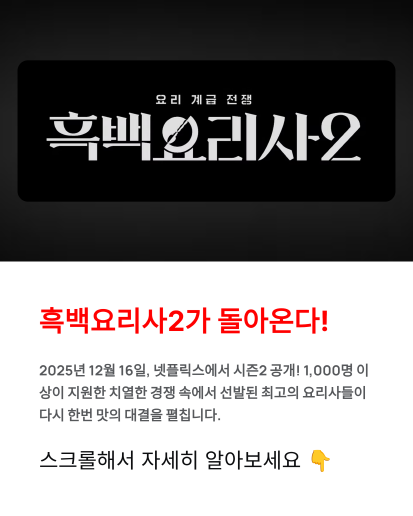 드디어 확정됐어요! 흑백요리사2는 2025년 12월 16일에 넷플릭스를 통해 공개될 예정입니다. 시즌1이 2024년에 엄청난 화제를 모았는데, 벌써 1년 만에 시즌2로 돌아오는 거죠.