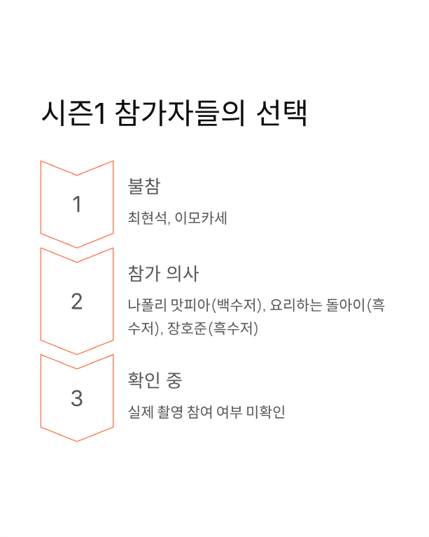 시즌1 참가자들 중에서는 어떻게 될까요? 최현석과 이모카세는 참가하지 않겠다고 했고, 나폴리 맛피아는 백수저로, 요리하는 돌아이와 장호준은 흑수저로 참가 의사를 밝혔어요. 하지만 실제 촬영에 참여했는지는 아직 확인되지 않았답니다.