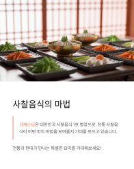 특히 선재스님은 대한민국 사찰 음식 1호 명장이시라고 하네요. 사찰 음식이 과연 어떤 맛의 마법을 보여줄지 정말 기대되지 않나요?
