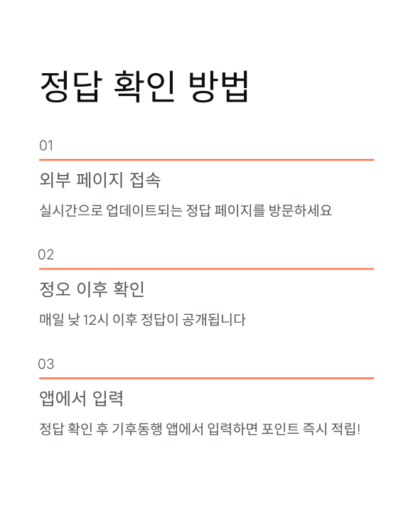 오늘 11월 6일 기후동행 퀴즈의 정답은 외부 링크에서 확인 가능합니다. 정오 알람 설정해두시고 매일 꾸준히 참여하세요. 환경도 지키고 용돈도 챙길 수 있는 일석이조 기회니까요!