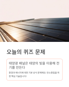 환경과 에너지에 대한 기본 상식을 묻는 문제예요. 요즘은 아파트 옥상이나 주택 지붕에서도 쉽게 볼 수 있죠. 탄소중립을 위한 핵심 기술 중 하나이기도 합니다!
