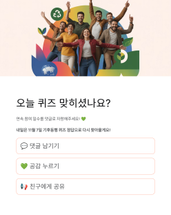 여러분은 오늘 퀴즈 정답 맞히셨나요? 댓글로 연속 참여 일수 자랑해주시고 💚 공감 버튼도 눌러주세요! 내일은 “11월 7일 기후동행 퀴즈 정답 링크”로 다시 찾아올게요!