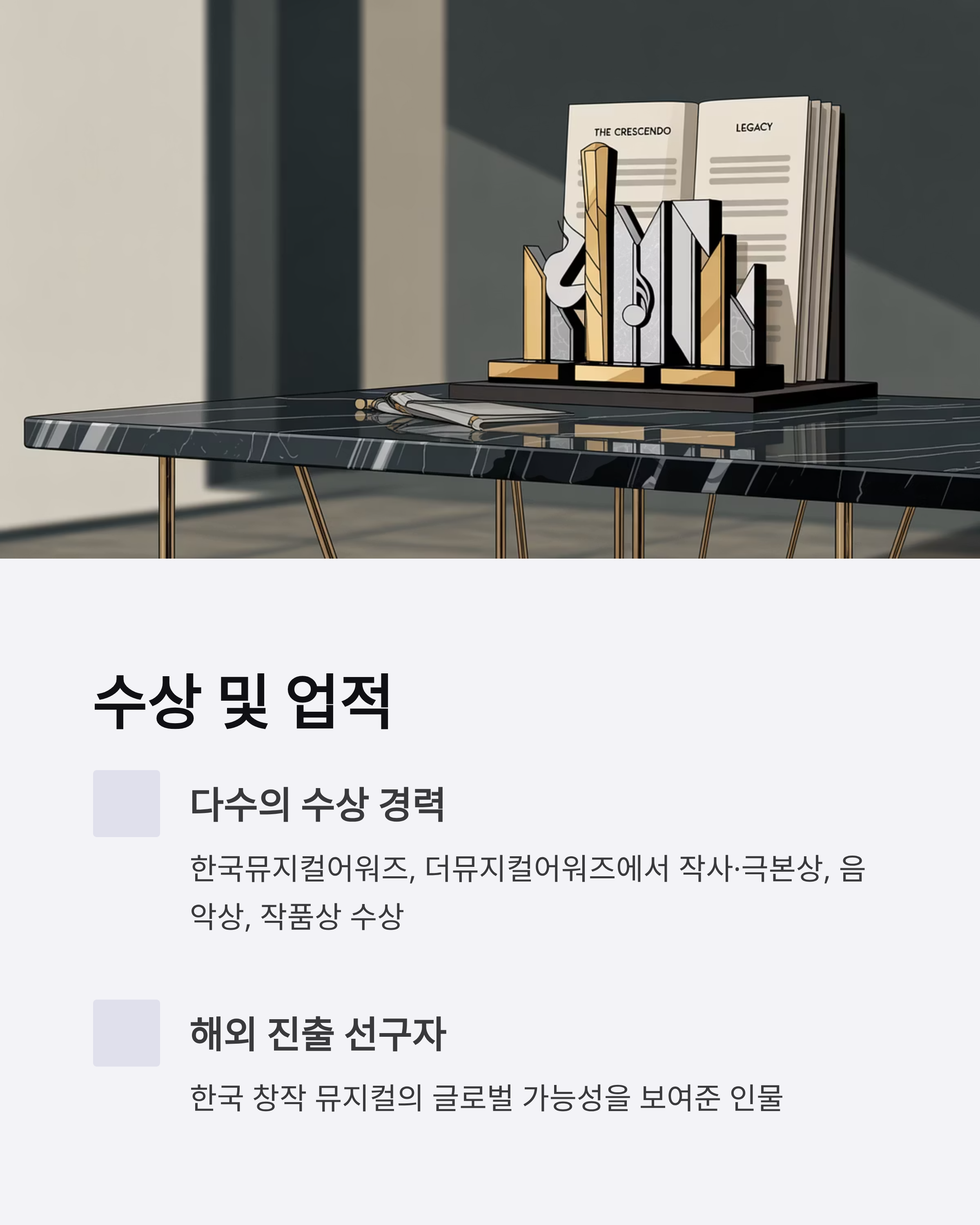 작사·극본상, 음악상, 작품상 다수 수상 - 창작 뮤지컬의 해외 진출 가능성을 보여준 인물로 평가