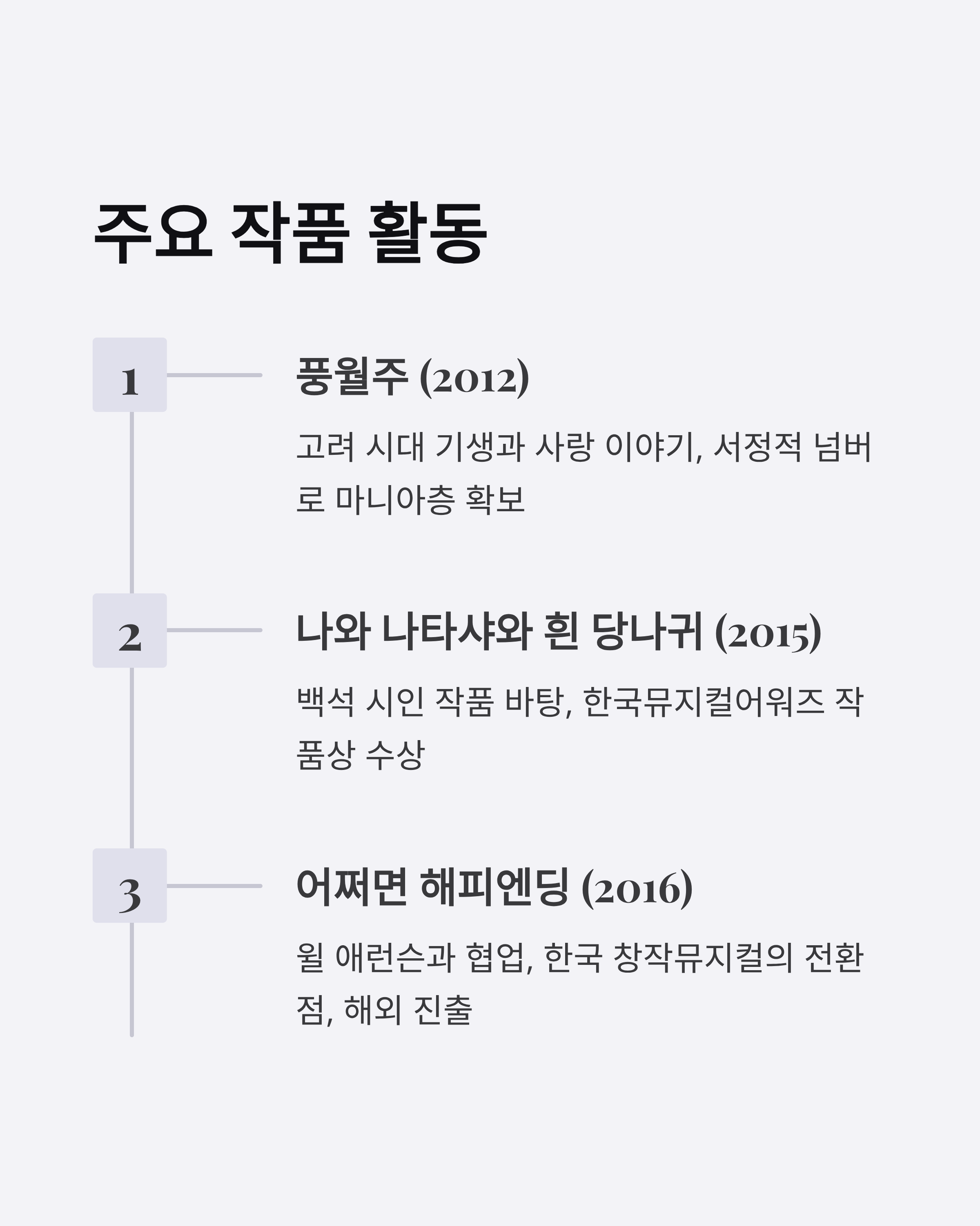 - 한국적 정서와 현대적인 뮤지컬 문법을 절묘하게 결합하는 능력으로 평가받음