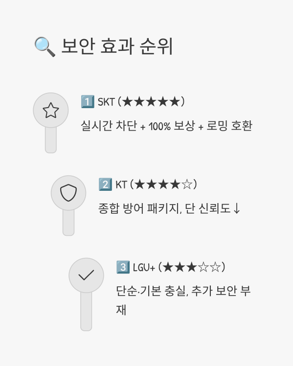 1순위: KT - 스미싱 차단까지 포함된 토탈 케어 2순위: SKT - FDS 시스템으로 고도화된 탐지