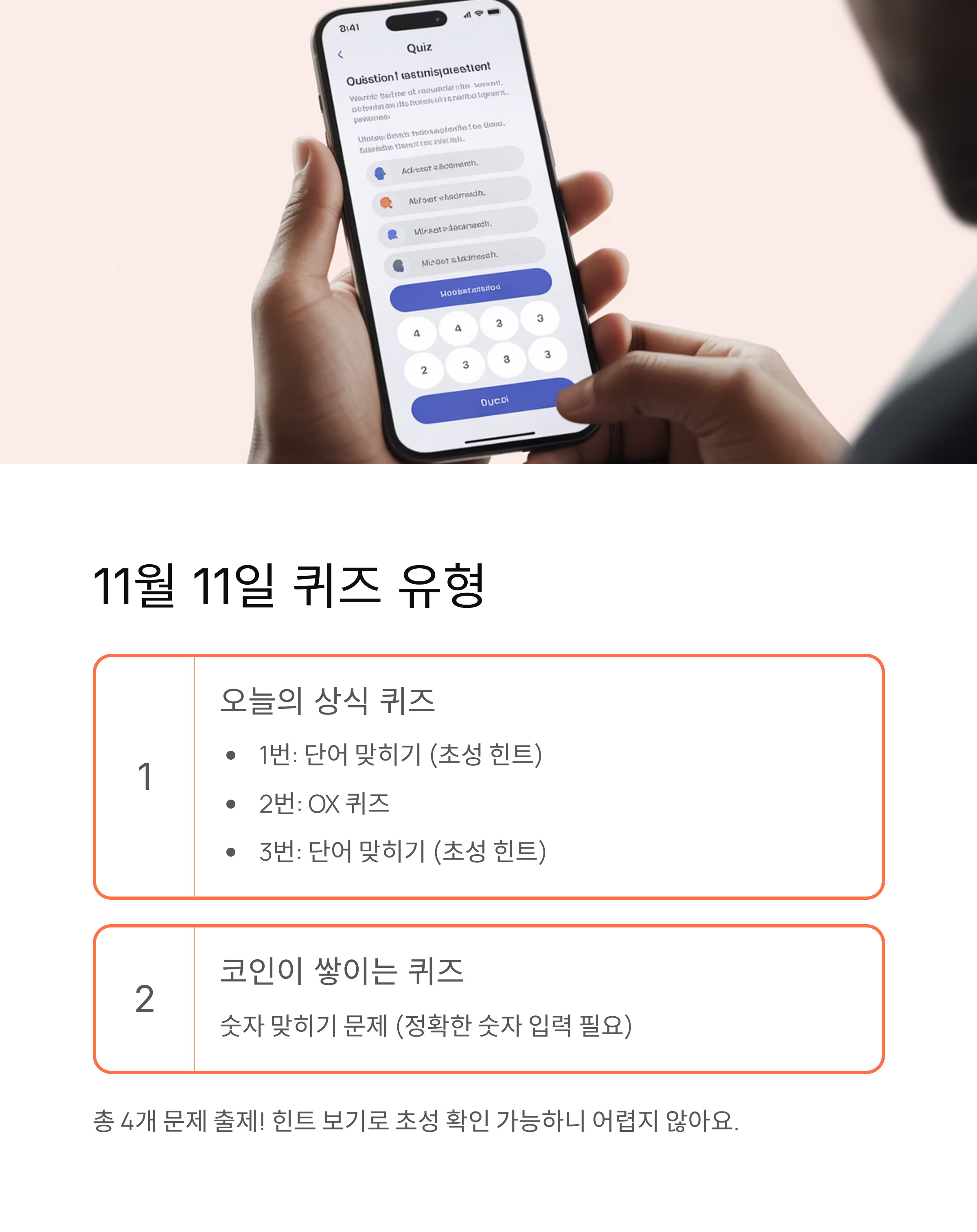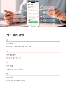 퀴즈 화면에서 문제를 확인하고, 모르겠다면 '힌트 보기'를 눌러보세요. 초성 힌트가 나오니까 답을 훨씬 쉽게 맞힐 수 있어요. 정답을 입력하고 제출하면 바로 코인이 적립돼요. 정말 쉽죠?